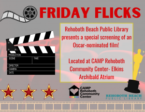 Due to the extensive renovations currently underway on our building, we have had to suspend our regular weekly Friday Flicks. However, we are excited to announce that we are partnering with CAMP Rehoboth to screen a few of the films that have been nominated for Academy Awards this season. The screenings will take place at CAMP Rehoboth’s Elkins-Archibald Atrium at 37 Baltimore Ave, Rehoboth Beach.
